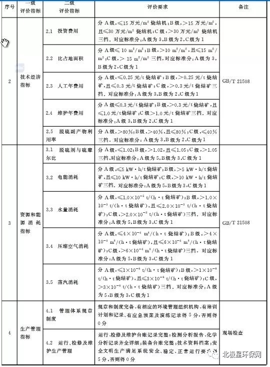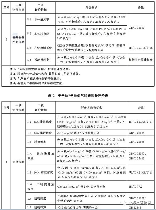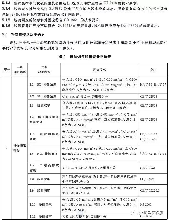 日前,中華人民共和國國家質量監督檢驗檢疫總局、中國國家標準化管理委員會發布《鋼鐵燒結煙氣脫硫除塵裝備運行效果評價技術要求GB/T 34607-2017  》。根據標準要求,鋼鐵燒結煙氣脫硫除塵裝備運行效果評價總分為100分,其中:脫硫裝備包括環保性能評價30分,技術經濟評價15分,資源和能源消耗評價25分、生產管理評價10分和主要裝備性能評價20分;除塵裝備包括環保性能評價40分,生產管理評價20分和主要裝備性能評價40分。濕法脫硫性能指標包括SO2排放濃度、SO3排放濃度、脫硫效率、霧滴濃度、顆粒物排放濃度、NOx濃度、二惡英濃度等,詳見表1。半干法/干法脫硫性能指標包括SO2排放濃度、SO3排放濃度、脫硫效率、顆粒物排放濃度、NOx濃度、二惡英濃度等,詳見表2。電除塵、袋除塵主要性能指標包括顆粒物濃度、去除率、本體漏風率、壓力降等,詳見表3、4。